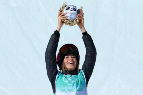 谷爱凌在冬奥赛场上捧起了金色冰墩墩